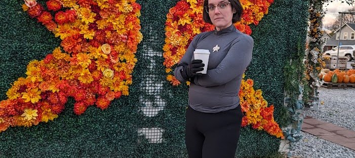 Pretty much since I fell in love with Janeway, I wanted to be her for Halloween, but a “grey-tank” version of her. When the Captain takes off her outer jacket and is just wearing either her turtleneck or, in even more serious contexts, just her grey tank, it means the Captain is about to kick ass. I think I pulled it off, even if Janeway had to put on her jacket because it was frigid.